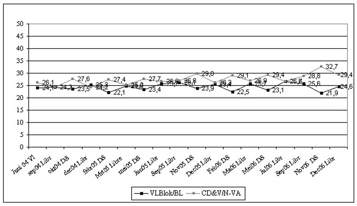 Figuur 3. Peilingen naar stemintenties (Vlaanderen) voor CD&V/N-VA en VLBlok/Belang in De Standaard (en VRT) en La Libre Belgique (De Morgen/VTM/RTL) na de verkiezingen voor de Vlaamse Raad (juni 2004) tot december 2006.