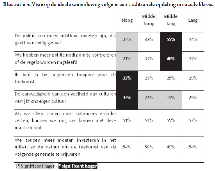 - Het valt ook op te merken dat ‘milieu en natuur’ zeker niet gekenmerkt worden door een klasseonderscheid en ook dat ‘law and order’ bij de lagere groepen meer naar waarde geschat worden. Dit staat vaak haaks op de imagobepalende media-initiatieven van intellectueel links. Merk ook op dat er een spanningsveld is rond het probleem om samen te leven met andere culturen (Illustratie 5).