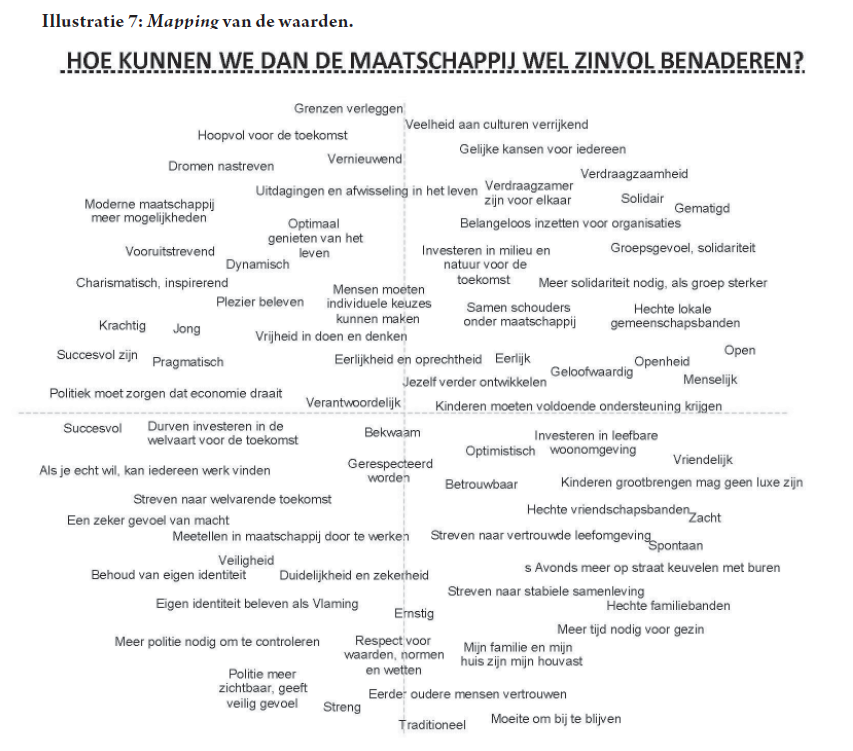 De gebruikte statistische perceptuele mappingtechniek geeft aan hoe mensen een verwantschap ervaren tussen de aangeboden waarden. Begrippen die in de mapping ruimtelijk en van mekaar liggen worden dus door individuele respondenten minder vaak samen als belangrijk geselecteerd (Illustratie 7).