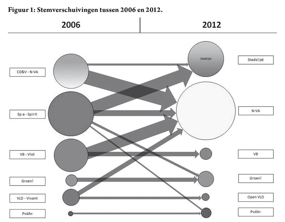 In vergelijking met de verkiezingen van 2006 zijn er in Antwerpen grote groepen kiezers van kamp veranderd. Dat gebeurde echter overwegend voor de start van de eigenlijke verkiezingscampagne. We kunnen moeilijk achterhalen wanneer dat precies gebeurde, maar het lijkt erop dat de N-VA-aanhang bij regionale en nationale verkiezingen in 2009 en 2010 sterk is gegroeid, en dat deze tendens die zich ook bij de gemeenteraadsverkiezingen in Antwerpen verder heeft doorgezet. Onze gegevens tonen aan dat de N-VA niet enkel ten koste van het Vlaams Belang is gegroeid. Ook kiezers die in 2006 nog VLD-Vivant of sp.a-Spirit kozen, opteerden in 2012 voor de N-VA. Bovendien is haast de volledige achterban van het toenmalige ‘Vlaamse kartel’ gevolgd naar N-VA, slechts een minderheid CD&V-getrouwen ging over naar de Stadslijst.