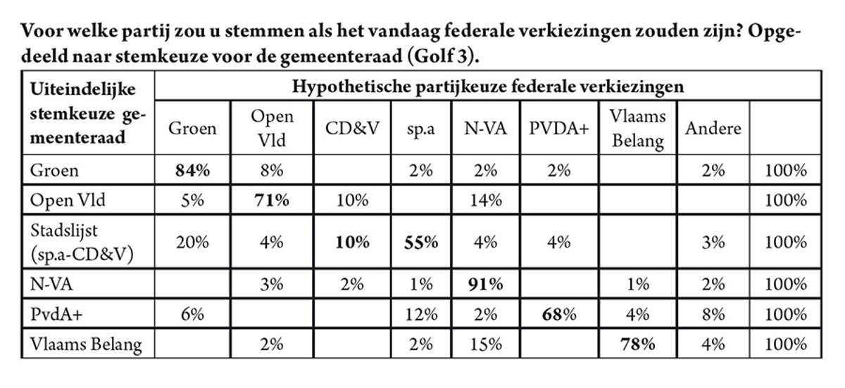 1/ Het gaat om een eerste analyse die, zoals elk kiezersonderzoek, met de nodige voorzichtigheid moet worden geïnterpreteerd. We steunen op een steekproef uit het internetpanel dat is opgezet door Ivox (zie toelichting achteraan). Dat neemt niet weg dat vertekeningen mogelijk zijn. In termen van politieke voorkeur bevat ons panel een oververtegenwoordiging van N-VA-kiezers, en een ondervertegenwoordiging van kiezers van de Stadslijst (sp.a & CD&V). Anderzijds werd de omvang van een kleine partij als de PVDA+ wel correct ingeschat.