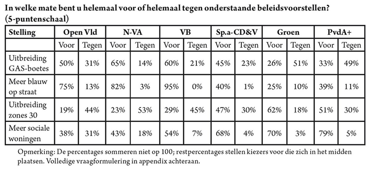Na vele decennia van een eerder centrumlinks bestuur is een centrumrechtse coalitie aan de macht gekomen in Antwerpen. De drie meerderheidspartijen baseren hun akkoord zoveel mogelijk op hun eigen programma en hopen zo de voorkeuren van hun eigen kiezers te vertegenwoordigen en bij de volgende verkiezing nogmaals op hun stem te kunnen rekenen. Een eenduidig centrumrechts beleid ligt dus voor de hand, maar als we het aan onze respondenten vragen krijgen we een complexer beeld met een aantal tegenstellingen binnen het electoraat van één partij. Ook de achterban van oppositiepartijen is niet altijd heel eenduidig.