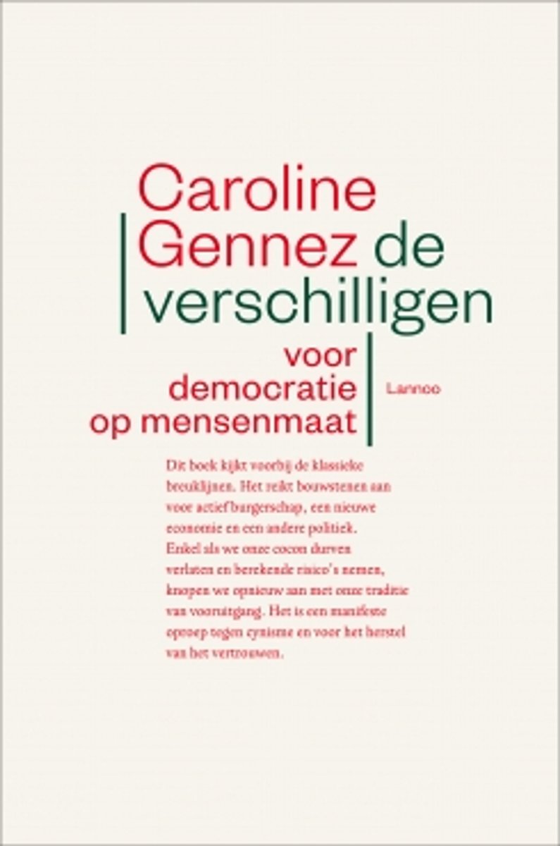 Gennez vindt dat de klassieke breuklijnen hun tijd gehad hebben. De tegenstelling tussen katholieken en vrijzinnigen is vervaagd. Mensen zijn cultureel nog wel katholiek, maar de kerk kan de moraal niet meer dicteren. Het heeft wel voor gevolg dat vooral het katholiek onderwijs een zwak pedagogisch project aanbiedt. De tegenstelling tussen arbeid en kapitaal is radicaal veranderd. In een bedrijf zie je nog nauwelijks het onderscheid tussen rood en groen. Laten we daar geen tijd aan verspillen, maar van onderuit werken aan een nieuwe economie. De tegenstelling ten slotte tussen Vlamingen en Walen is irrelevant geworden. Eigenlijk zijn de Vlamingen gewoon ontvoogd. Daar stelt zij een democratisch stakeholdersmodel tegenover, een model op mensenmaat waarin alle belangen aan bod komen. Om dat te realiseren heb je ‘verschilligen’ nodig, mensen die betrokken willen zijn, die willen participeren. En precies aan die mensen wil zij een project aanbieden dat de waan van de dag overschrijdt. Een project dat uiteindelijk het goede leven in een hechte gemeenschap mogelijk maakt.
