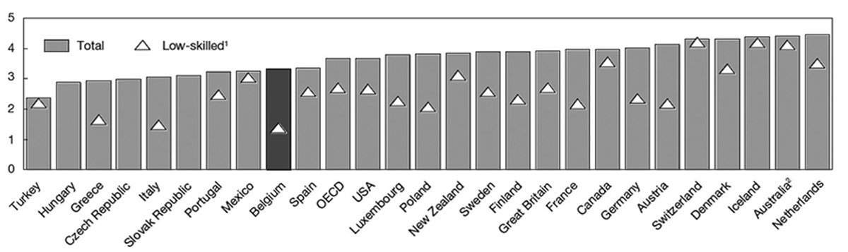 Volgens de OESO is de ontslagbescherming voor reguliere arbeidscontracten in België iets minder strikt dan het OESO-gemiddelde. Maar deze indicator verhult enorme verschillen tussen arbeiders en bedienden.4 Voor die laatste groep maakt men bovendien een onderscheid tussen hoge en lage bedienden, volgens het loon dat ze verdienen. De opzeggingstermijn voor een arbeider bedraagt doorgaans minder dan één maand voor elke vijf jaar anciënniteit, terwijl die termijn voor laagbetaalde en hoogbetaalde bedienden respectievelijk drie en vijf maanden bedraagt. Dit betekent dat de ontslagbescherming in België voor hogere bedienden wellicht tot de strengste in de OESO behoort, terwijl net het omgekeerde geldt voor arbeiders. De strikte ontslagbescherming zou daarom een moeilijke overgang van school naar werk als bediende kunnen verklaren, maar niet naar werk als arbeider. Laaggeschoolden worden vooral als arbeider tewerkgesteld en hooggeschoolden als bedienden. De strikte ontslagbescherming kan daarom niet verklaren waarom laaggeschoolde jongeren zo moeilijk aan een baan raken. Voor hooggeschoolden is dit wel een mogelijke verklaring, maar voor die groep is het probleem niet zo acuut.