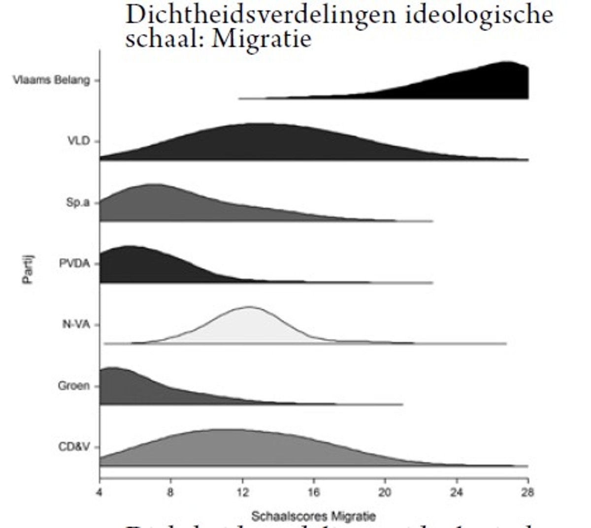 Voor de sociaal-culturele dimensie kijken we naar het belangrijkste thema dat deel uitmaakt van deze dimensie; immigratie. Als we kijken naar immigratie zien we dat vooral de VB-kandidaten vrij eensgezind afwijzend staan ten aanzien van migratie. Bijna 90% van de ondervraagde VB-kandidaten is het redelijk tot volledig eens met de stelling dat de grenzen moeten worden gesloten voor asielzoekers. De ‘linkse’ partijen Groen, sp.a en PVDA+ vormen het spiegelbeeld met een overwegend positieve houding. De kandidaten van Open VLD, CD&V en N-VA bevinden zich overwegend in het centrum van deze schaal. Maar waar er bij Open VLD en CD&V veel variatie is in de opinies van hun kandidaten zijn er bij N-VA veel minder afwijkende meningen. Ditzelfde patroon vinden we terug bij de andere twee thema’s binnen deze dimensie.