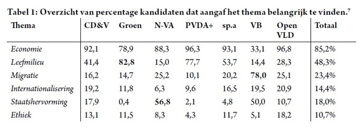 Maar zoals eerder gezegd, is er meer nodig opdat inhoudelijk onderscheiden ideologische dimensies echte breuklijnen worden. Partijen moeten er ook belang aan hechten. Ze moeten ervoor willen gaan. In Tabel 1 geven we een overzicht van het aandeel van de kandidaten in de verschillende partijen die belang hechten aan een ideologische (sub)dimensie. De traditionele economische scheidslijn staat nog steeds centraal. Een ruime meerderheid van de kandidaten van zowat alle partijen geeft aan dat dit een van de belangrijkste thema’s is (Tabel 1). Op ruime afstand volgt de sociaal-culturele scheidslijn, waarvan vooral het leefmilieu voor de linkse partijen van belang lijkt te zijn. VB-kandidaten scoren ook op deze breuklijn door het hoge belang dat ze hechten aan het thema migratie en asiel.