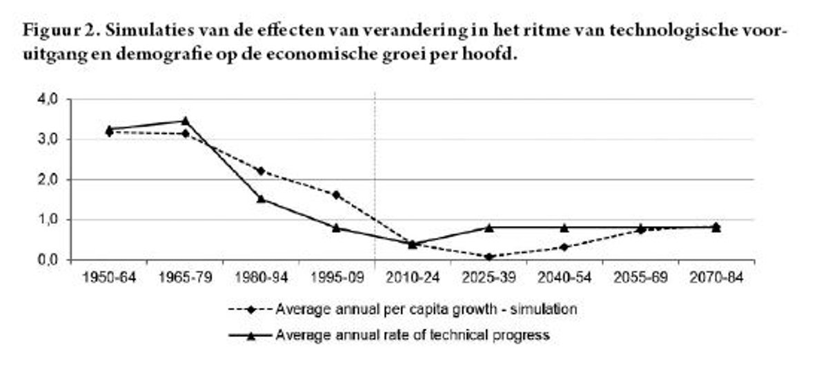 Naast de voorspelling van langdurige lage groei per hoofd van de bevolking, voorspelt het model nog twee bijkomende interessante resultaten.