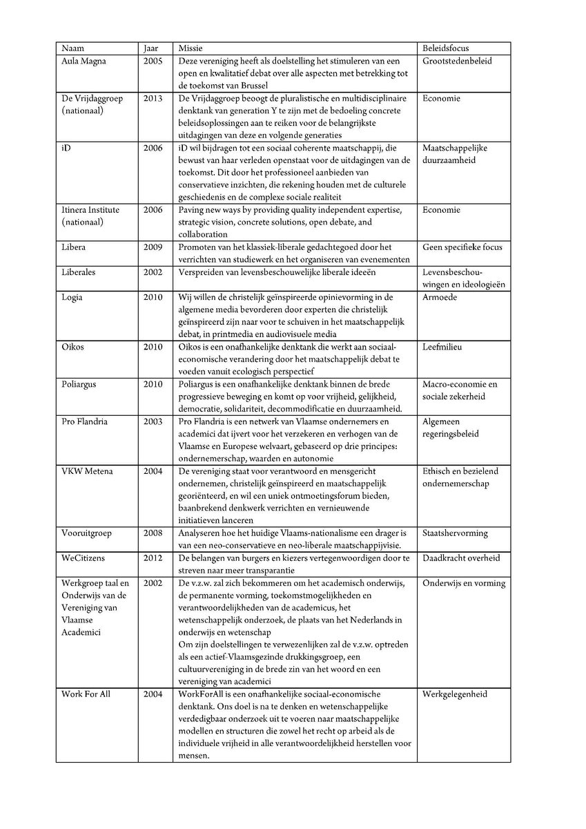 Als we kijken naar de missie van de denktanks, zien we een divers palet. Terwijl sommige van de organisaties focussen op concrete en soms zeer specifieke beleidsthema’s, zoals onderwijs (Werkgroep Taal en Onderwijs) of de toekomst van Brussel (Aula Magna), zetten andere een bepaalde politieke filosofie of ideologie centraal, bijvoorbeeld liberalisme (Libera en Liberales) of ecologie (Oikos), of zijn ze (mede) religieus geïnspireerd (zoals bijvoorbeeld Logia en VKW Metena). Uit onze survey bleek ook dat denktanks die sterk ideologisch geïnspireerd zijn eerder samenwerken met gelijkgezinde politieke partijen of belangenorganisaties. De erfenis van de verzuiling lijkt dus nog steeds aanwezig. In vergelijking met andere landen, zien we echter relatief weinig uitgesproken ideologische denktanks. Er is slechts een zeer beperkt aantal denktanks dat zich expliciet karakteriseert als ‘progressief’ of ‘conservatief’. Vooral op links zien we een schraal landschap. Er is enkel de Stichting Gerrit Kreveld, die in 1994 ontstond en vandaag de uitgever is van Samenleving en politiek. En recent ontstond de linkse denktank Poliargus, rond een groep voornamelijk Gentse academici. Wat de thematische beleidsfocus betreft, geeft Tabel 1 een gemengd beeld. Enerzijds bestrijken de bevraagde denktanks een zeer diverse set van beleidsdomeinen, anderzijds stellen we ook een sterke focus op economische thema’s vast.