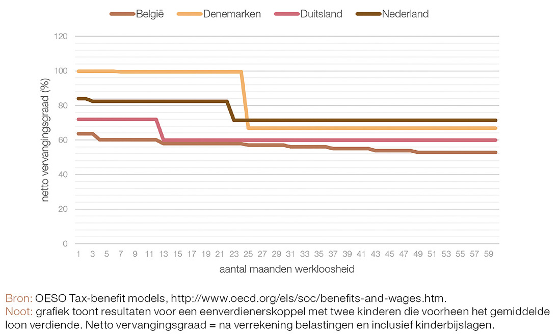 Met een netto vervangingsgraad van 64% bij de start van de werkloosheid is België niet genereus. Nederland, Duitsland en zeker ook Denemarken kennen hogere uitkeringen in de initiële fase van de werkloosheid. De daling van de vervangingsgraad voor langdurig werklozen is in het Belgische stelsel wel minder sterk dan in veel andere landen. De spanning tussen de bedragen voor kortdurende en langdurige werkloosheid is klein. In de andere landen zijn de uitkeringen beperkt in de tijd. Mensen moeten er na verloop van tijd beroep doen op de sociale bijstand (wat bij ons het leefloon is). In Denemarken is dat bijvoorbeeld na 2 jaar. Opvallend genoeg is de netto vervangingsgraad van de sociale bijstand in deze landen nog steeds hoger dan de werkloosheidsuitkeringen bij ons.
