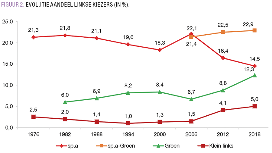 Figuur 1 geeft de evolutie weer van de deelname van socialistische, groene en extreemlinkse lijsten aan de gemeenteraadsverkiezingen tussen 1976 (de eerste gemeenteraadsverkiezingen anticiperend op de samenvoeging van gemeenten in 1977) en 2018. Onder extreemlinkse kiezers bedoelen we die stemmen die tussen 1976 en 2018 uitgebracht zijn op KPB, RAL-SAP, AMADA-PVDA en een aantal linkse eenheidslijsten.
