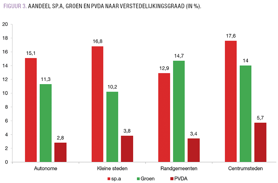 Figuur 3 geeft de actuele verschillen weer voor sp.a, Groen en PVDA. De weergegeven cijfers voor de socialistische partij slaan zowel op die gemeenten waar ze alleen naar de kiezer (eventueel onder een lokale benaming) trok als deze waar dat in kartelverband met Groen gebeurde.3
