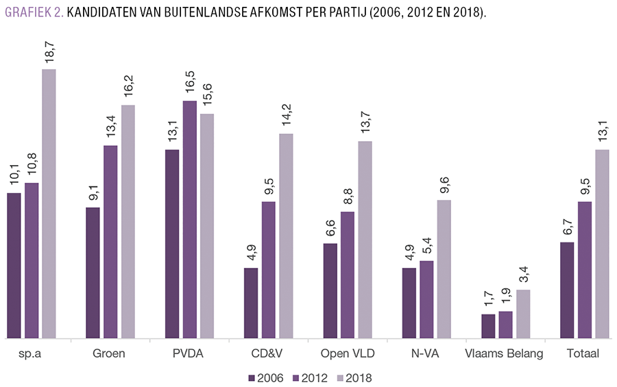 Een vergelijking met de kieslijsten van 2006 en 2012 (Grafiek 2) toont aan dat het aandeel kandidaten met een migratieachtergrond in bijna alle partijen toeneemt, met sp.a als sterkste stijger. De daling bij PVDA kan worden verklaard doordat ze in 2018 meer (volledige) kandidatenlijsten heeft ingediend in kleinere centrumsteden met een minder diverse bevolking.