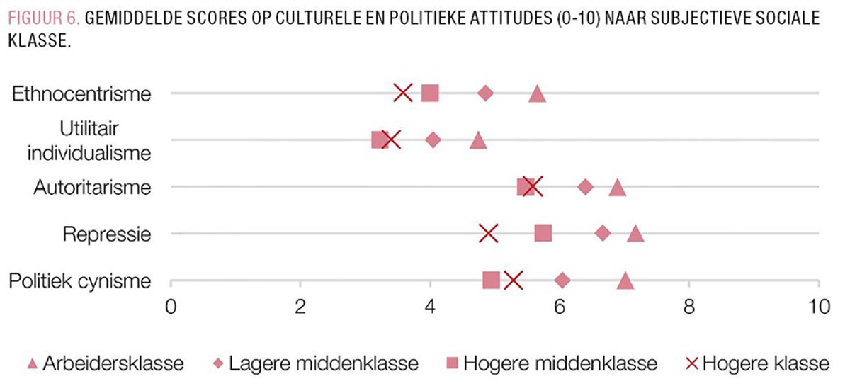 Ten tweede blijkt dat culturele thema's de verschillende sociale klassen meer verdelen dan sociaaleconomische thema's. Er zijn relatief kleine verschillen tussen arbeidersklasse en beide segmenten van de middenklasse als het gaat over de houding ten aanzien van arbeidsethiek, sociale herverdeling, de vrijmaking van de markt of de vakbonden (Figuur 5). Op de culturele en politieke breuklijn (Figuur 6) is er echter beduidend meer verdeeldheid. De arbeidersklasse wordt gekenmerkt door een uitgesproken etnocentrisme, autoritarisme, recht-en-orde denken en politiek cynisme: het politieke establishment wordt verweten wereldvreemd en hypocriet te zijn, en de multiculturele samenleving en afwijkend gedrag worden krachtdadig afgekeurd. De arbeidersklasse heeft een grotere kans om een cynische minachting ten aanzien van de politiek te koppelen aan een radicaal autoritair en etnocentrische wereldbeeld. Relevanter is echter dat ook de lage middenklasse heel wat moeite heeft met de globaliserende, individualiserende en permissievere samenleving. Onze resultaten geven aan dat de lagere middenklasse een tussenpositie inneemt, waarbij het de lagere middenklasse zelfs eerder lijkt aan te sluiten bij het ideologische profiel van de arbeidersklasse dan dat van de hoge middenklasse. In het algemeen mondt de bezorgde kwetsbaarheid van de lage middenklasse niet zozeer in een rabiate verwerping van de sociale veranderingen, maar wel in een sceptische houding ten aanzien van het huidige politieke bedrijf en de multiculturele samenleving. Ook lage middenklassers hebben de indruk dat vreemdelingen en afwijkende Anderen een buitensporige druk leggen op de publieke orde, dat ze te weinig moeite doen om zich aan te passen aan de gevestigde normen en waarden en dat ze te weinig bijdragen aan de sociale zekerheid, terwijl hun kritiek zich tevens richt op de politiek die dit zomaar laat gebeuren én te weinig de waarden en belangen van correcte en hardwerkende middenklasse zou behartigen.