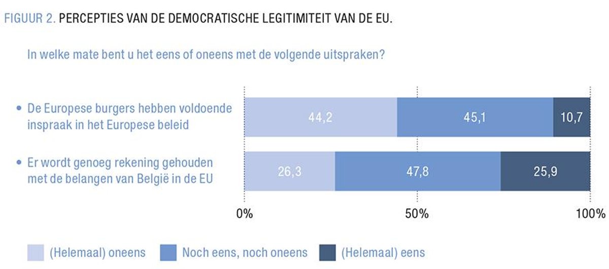 De legitimiteit van de EU staat stevig onder druk omwille van het zogenaamde democratische tekort wat betreft de manier waarop de besluitvorming binnen de instellingen verloopt en de belangen vertegenwoordigd worden. Slechts drie op de tien Vlamingen zijn tevreden over de werking van de democratie in de EU, terwijl twee op tien uitgesproken ontevreden zijn. Bij heel wat Europeanen leeft het gevoel dat zijzelf en hun land maar weinig invloed hebben op wat er op Europees niveau beslist wordt. Dit blijkt duidelijk ook het geval te zijn in Vlaanderen: slechts een kwart van de Vlamingen vindt dat de belangen van België voldoende behartigd worden in de EU en amper één op de tien Vlaamse kiezers is ervan overtuigd dat de Europese burgers voldoende inspraak hebben in het Europese beleid. Daarnaast zou de EU te veel de belangen van de grote bedrijven en de grootste lidstaten verdedigen. Niet minder dan zes op tien Vlamingen zijn van mening dat de grootste landen te veel macht hebben in de EU, terwijl 40% beaamt dat de EU alleen de belangen van de grote bedrijven, niet van haar burgers verdedigt.