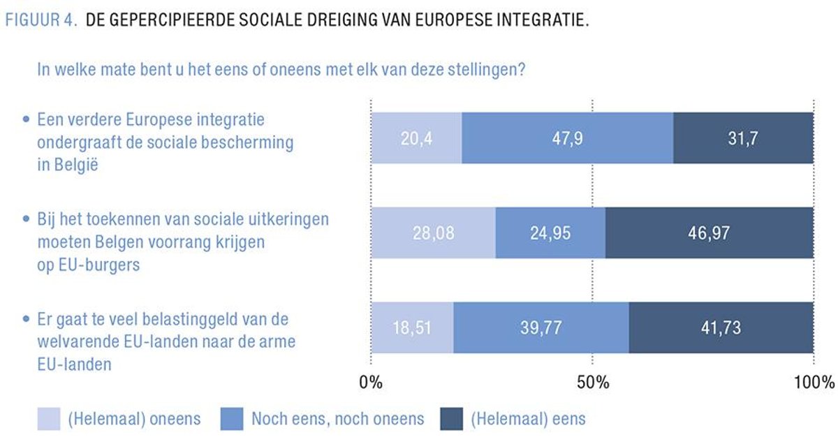 De processen van uitbreiding en verdieping hebben er tevens voor gezorgd dat de grenzen van de nationale welvaartsstaat eroderen. De Europeanisering lijkt sowieso sterke gevoeligheden met betrekking tot het herverdelingsvraagstuk bloot te leggen. Zo vindt 47% van de Vlamingen dat bij het toekennen van sociale uitkeringen, Belgen voorrang moeten krijgen op EU-burgers; en drie op de vier vindt dat EU-burgers eerst werk moeten hebben voor ze toegang krijgen tot sociale voorzieningen. Tegelijkertijd gaan stemmen op voor meer verregaande vormen van interpersoonlijke solidariteit tussen EU-burgers: 49% van de Vlamingen vindt dat de EU maatregelen moet nemen om de inkomensverschillen tussen alle EU-burgers te verkleinen. Dit geeft aan dat er toch een aanzienlijke bereidheid is tot solidariteit met mede-Europeanen.