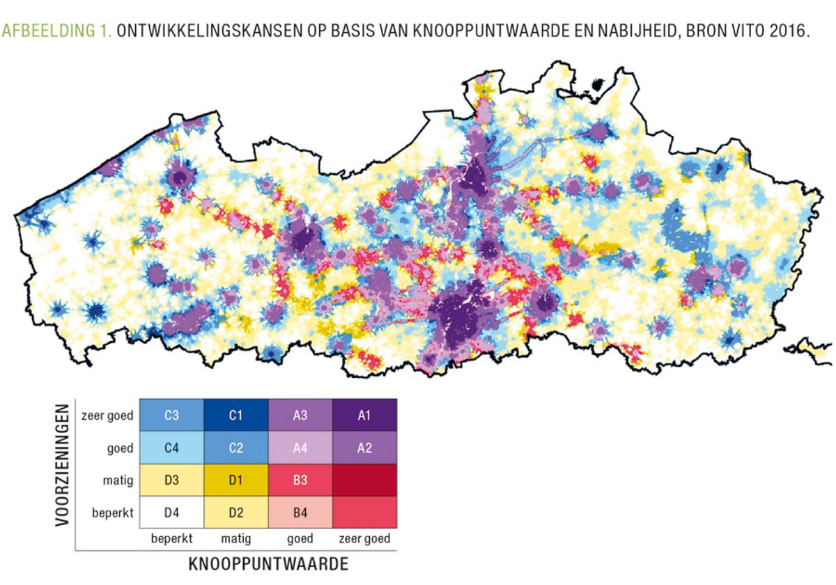 De stedelijke agenda werd in het witboek uit 2016 verder uitgewerkt. De Vlaamse overheid wil de verdere verstedelijking vooral concentreren in vervoerscorridors en in regio's met een stedelijk karakter. Vlaanderen hoopt daarmee de auto-afhankelijkheid te verkleinen en het gebruik van openbaar vervoer te stimuleren. Binnen de stedelijke regio's moet worden geïnvesteerd in een betere 'verknoping' en in 'metropolitane hefboomplekken' met een 'grote aantrekkingskracht' op (internationale) bezoekers en investeerders. Het witboek ziet die hefboomplekken als 'sterk dynamische en de klok rond levendige plekken'. Bij de voorbereiding van het witboek tekende de Vlaamse instelling voor technologisch onderzoek (VITO) een kaart met de gebieden met veel en weinig potentie (Afbeelding 1).