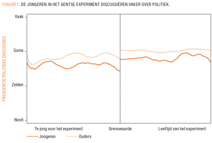 Maar het meest duidelijke resultaat zien we als we gaan kijken naar discussies over politiek binnen het gezin. Dat is een belangrijke indicator, omdat we weten dat jongeren op die leeftijd toch vooral nog met hun gezinsleden praten als ze hun mening willen vormen over belangrijke maatschappelijke problemen. Dat deze discussies vooral een gevolg waren van het Gentse experiment, kunnen we eenvoudig aantonen door precies te kijken naar wat gebeurt als de Gentse jongeren 16 worden. Diegenen die net een maand ouder waren dan 16 op de dag van de verkiezingen, kregen immers de uitnodiging binnen, terwijl diegenen die toen net te jong waren dat niet kregen. De geboortedatum van 14 oktober 2002 is dus cruciaal om na te gaan wie deel uitmaakte van het experiment en wie niet. In FIGUUR 1 rangschikken we de respondenten volgens hun leeftijd en zien we dat diegenen die waren opgenomen in het experiment inderdaad vaker over politiek discussiëren. Het mooie is bovendien dat als we dezelfde vraag stellen aan de ouders van de respondenten (de stippellijn in de figuur) dat we dan net dezelfde breuk zien, juist op die leeftijd van zestien jaar. De logische conclusie is dan ook dat die jongeren meer met hun ouders zijn gaan praten over politiek omdat ze een uitnodiging voor hun experiment hadden ontvangen.1