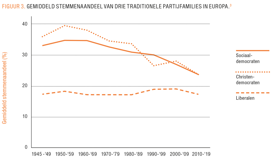 De drie traditionele partijen – sp.a, CD&V en Open VLD – behaalden in 1950 samen meer dan 90% van de stemmen; vandaag is dat nog geen 40%. Deze daling is echter geen uniek Vlaams fenomeen. In heel West-Europa zien we de teloorgang van de traditionele partijen – met het Verenigd Koninkrijk als grote uitzondering.