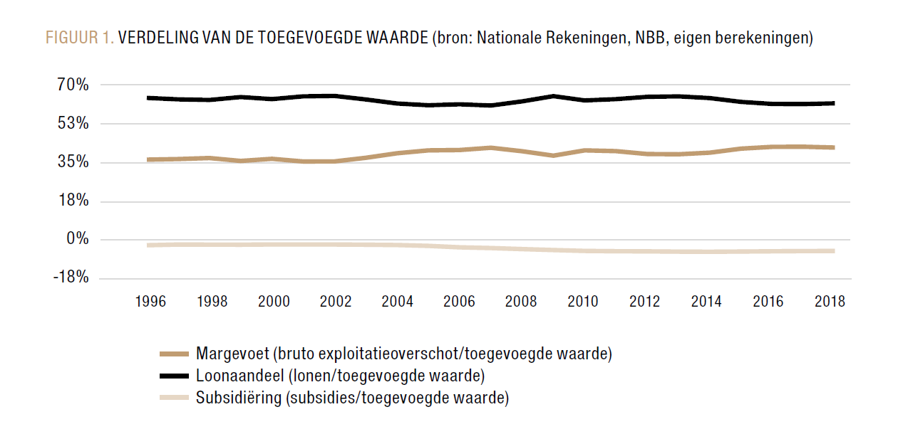 Belgische ondernemingen hebben het op vlak van rentabiliteit niet slecht gedaan. Uit FIGUUR 1 blijkt dat hun rentabiliteit voortdurend steeg. In 1996 hielden bedrijven 36% van de toegevoegde waarde voor zich. In 2018 had men al 42% van de toegevoegde waarde te verdelen. De 'concurrerende' component in deze vergelijking zijn de lonen. Logischerwijze is die factor gedaald. Maar de factor waardoor bedrijven vooral hun bruto-exploitatieoverschot wisten te verbeteren, zijn de subsidies. De subsidies staan in de verdeling van de toegevoegde waarde negatief, omdat ze van buiten de onderneming komen.