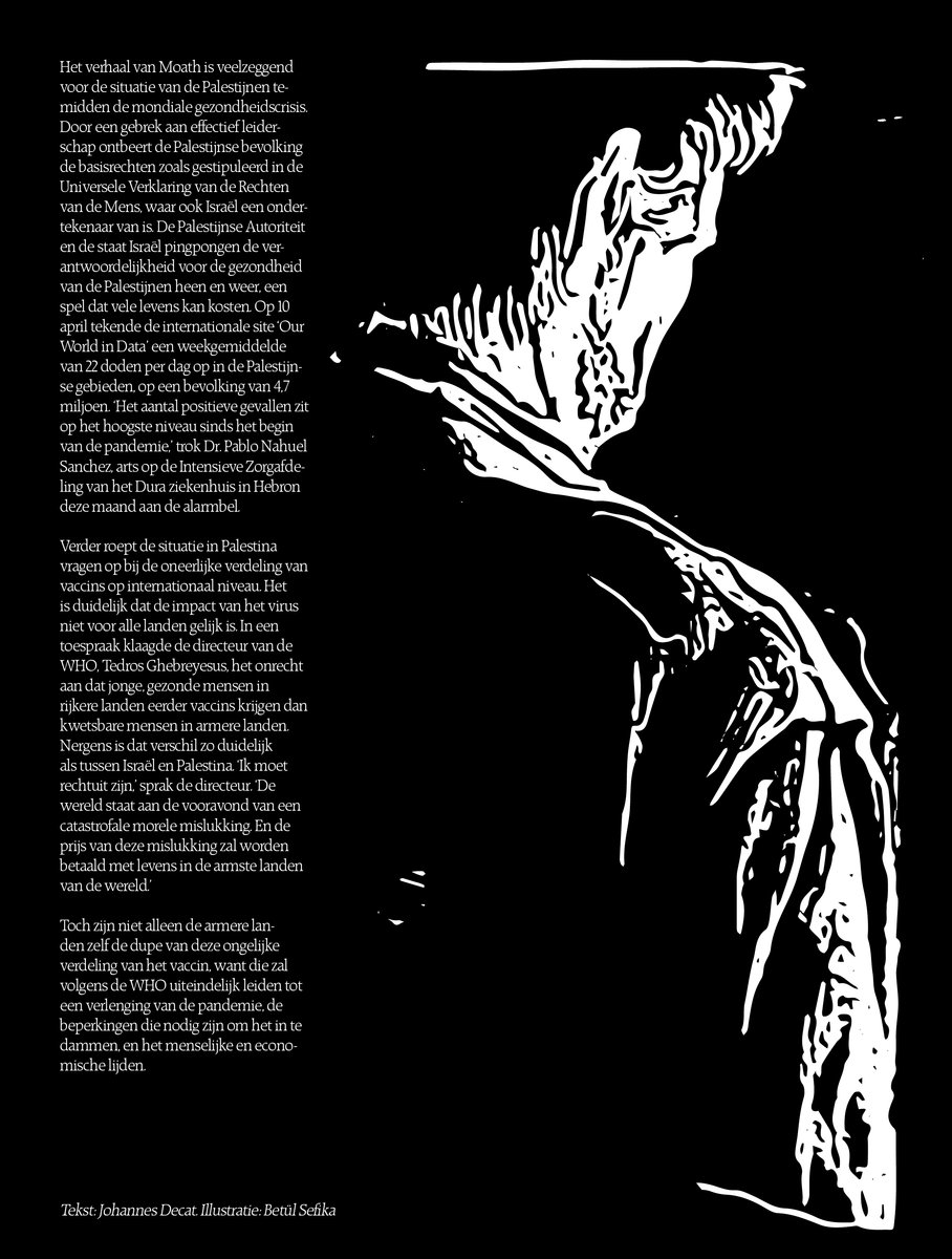 Uiteindelijk lukte het Ahmeds familie niet om Moath tijdig te laten vaccineren. Een week na het eerste interview laat Ahmed weten dat zijn broer positief is getest op Covid-19. Wanneer hij belt via WhatsApp heeft hij tranen in de ogen. 'Ik ben nu op weg met de auto naar mijn moeder,' zegt hij. 'Ik weet niet hoe ik haar het nieuws moet brengen.' Het verhaal van Moath is veelzeggend voor de situatie van de Palestijnen te midden de mondiale gezondheidscrisis. Door een gebrek aan effectief leiderschap ontbeert de Palestijnse bevolking de basisrechten zoals gestipuleerd in de Universele Verklaring van de Rechten van de Mens, waar ook Israël ondertekenaar van is. De Palestijnse autoriteit en de staat Israël pingpongen de verantwoordelijkheid voor de gezondheid van de Palestijnen heen en weer, een spel dat vele levens kan kosten. Op 10 april tekende de internationale site 'Our World in Data' een zevendaags gemiddelde van 22 doden per dag op in de Palestijnse gebieden, op een bevolking van 4,7 miljoen. 'Het aantal positieve gevallen zit op het hoogste niveau sinds het begin van de pandemie,' trok Dr. Pablo Nahuel Sanchez, arts op de Intensieve Zorgafdeling van het Dura ziekenhuis in Hebron aan de alarmbel.