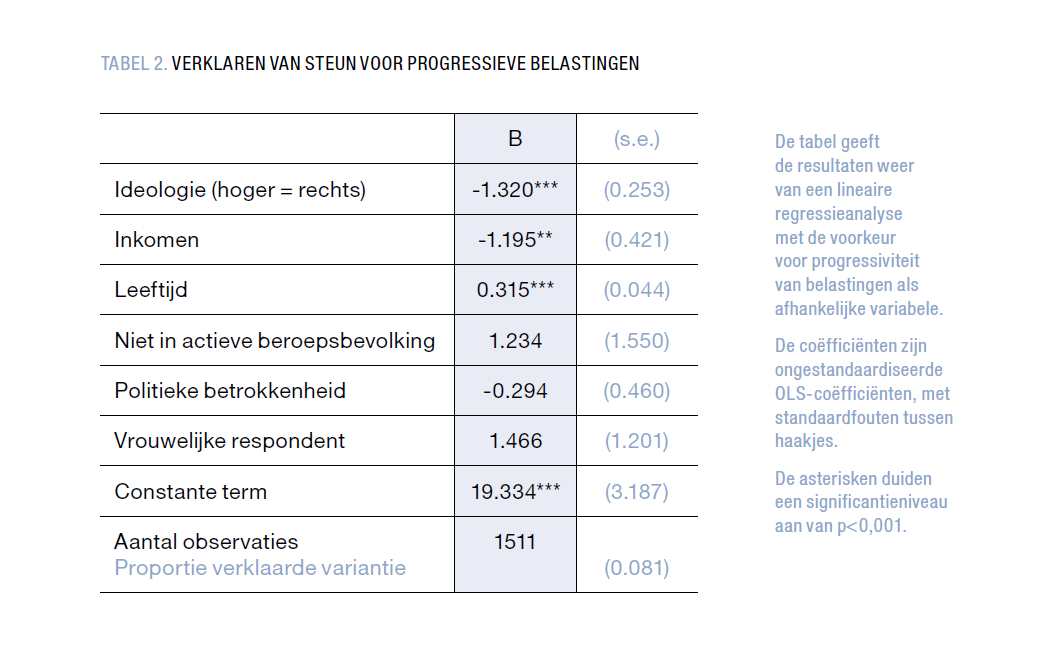 De resultaten van de analyse zien we in TABEL 2. De resultaten tonen steun voor beide grote verklaringsmodellen. Ideologie heeft duidelijk het sterkste effect: rechtse kiezers zijn minder gewonnen voor progressieve belastingen. Verschillende politici zeggen tegenwoordig graag dat het onderscheid tussen links en rechts achterhaald is. Wat we hier zien is echter dat het onderscheid nog altijd een bijzonder belangrijke invloed heeft op een cruciaal beleidsdomein als fiscaliteit. Daarnaast zien we ook een duidelijk effect van inkomen: veelverdieners blijken in mindere mate voorstander te zijn van progressieve belastingen. Een beetje tegen onze verwachting in, zien we in dit model geen rechtstreeks effect van politieke betrokkenheid.