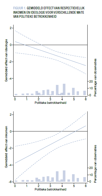 De resultaten van TABEL 1 moeten dus worden genuanceerd. De effecten zijn namelijk niet gelijk voor alle groepen in de samenleving. Diegenen met veel politieke betrokkenheid slagen er in hun ideologische voorkeur te koppelen aan een coherente stellingname. Diegenen zonder betrokkenheid vertrekken nogal lineair vanuit hun eigen inkomstenpositie.