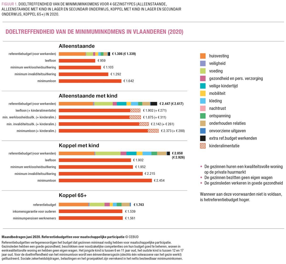De Belgische referentiebudgetten1, die sinds 2008 worden opgemaakt door CEBUD (Centrum voor budgetadvies en -onderzoek), vullen deze leemte op. Referentiebudgetten zijn geprijsde korven van goederen en diensten die, op basis van wetenschappelijk onderzoek, een antwoord geven op de vraag hoeveel inkomen een gezin minimaal nodig heeft om volwaardig aan de samenleving deel te nemen. Het antwoord op deze vraag is voor elk gezin anders en afhankelijk van individuele noden van het gezin. Zo resulteert een slechte gezondheidstoestand vaak in bijkomende financiële noden. Ook kenmerken van de maatschappij, zoals de betaalbaarheid van onderwijs, energie en openbaar vervoer, geven aanleiding tot verschillende financiële noden.