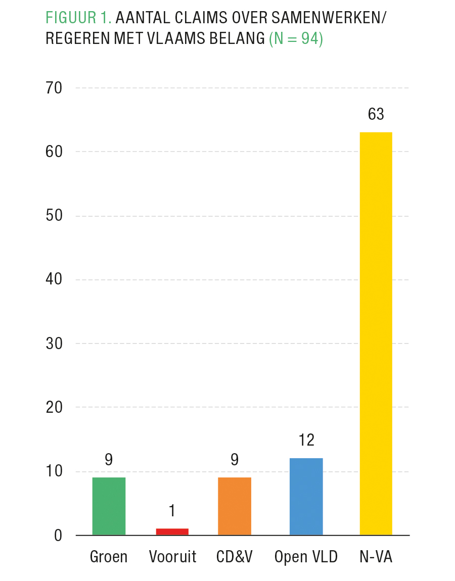 De Vlaamse politieke actoren verstuurden in totaal 94 tweets over eventuele samenwerking met Vlaams Belang. FIGUUR 1 toont aan dat vooral de centrumrechtse partijen oververtegenwoordigd zijn. De meeste claims zijn afkomstig van N-VA (63), Open VLD (12) en CD&V (9). De linkse partijen (Groen, Vooruit) maken weinig woorden vuil aan eventuele samenwerking met Vlaams Belang; vooral het lage aantal cmaims van Vooruit (1) is hierbij opvallend. Gezien de grotere ideologische kloof tussen Vlaams Belang en de linkse partijen lijkt dit logisch. Vooral de positie van N-VA – als grootste centrumrechtse Vlaamse partij die ideologisch het dichtste aanleunt bij Vlaams Belang en een partij waar Vlaams Belang zelf expliciet naar kijkt als partner – is relevant.