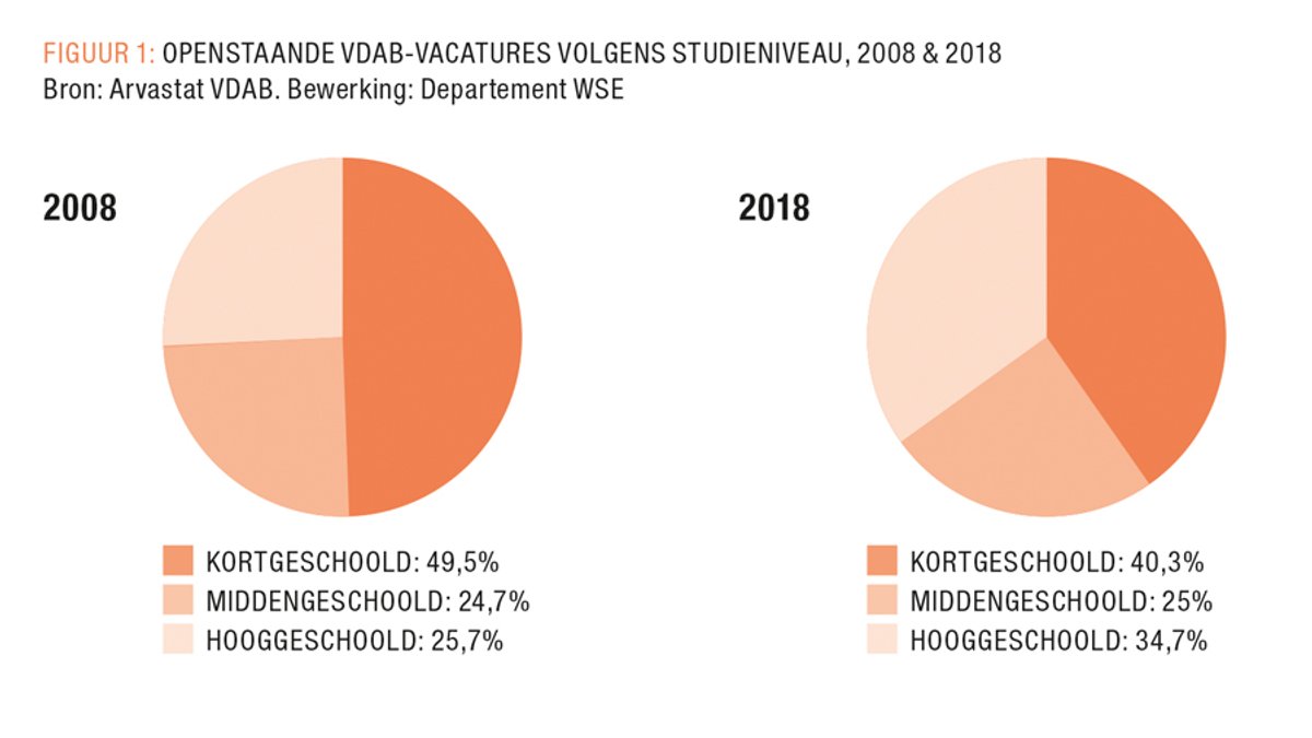 Anderzijds gaat studie dieper in op de opleidingsmismatch waarbij het arbeidsaanbod (werknemers en hun competenties) niet meer dreigt te matchen met de jobvraag, waarvoor andere profielen en competenties nodig zullen zijn. Essentieel hierin is dat er door technologie en digitalisering meer en meer vraag komt naar hooggeschoolde profielen, terwijl midden- en lager geschoolde profielen het moeilijker krijgen door het verdwijnen van jobs of het veranderen van de jobinhoud. Deze verschuiving in de vraag naar arbeid zien we tot 2018 ook weerspiegeld in de vacatures van VDAB: de vraag naar hoger geschoolde profielen neemt toe, terwijl de vraag naar kort- en middengeschoolden krimpt en in 2018 stabiliseert.