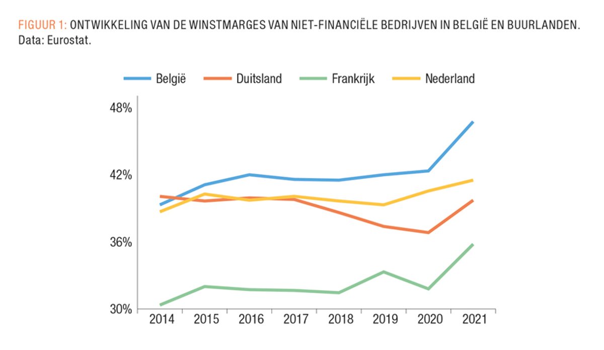 In de hele westerse wereld kruipen de winstmarges omhoog (Eeckhout, 2021), maar vooral tijdens de coronacrisis en heel specifiek in 2021 blijken deze in onder andere België flink te zijn opgekrikt (FIGUUR 1). We hebben dus te maken met een zeer sterke prijsstijging van energie die langzaam doorsijpelt in andere sectoren van de economie, deels als afspiegeling van de toegenomen exogene energiekosten en aan herstel gerelateerde inputkosten, maar eveneens als gevolg van het vermogen van bedrijven om hun winstmarges te verhogen. Bedrijven boeken historische winsten als gevolg van hun macht. Een stijging van de inputprijzen zou evengoed kunnen worden opgevangen door een afname van de winsten, maar bedrijven kiezen er – natuurlijk - voor om hun winsten in stand te houden of zelfs te verhogen. Wanneer bedrijven hun prijzen verhogen gebruiken ze hun machtspositie om de winsten te verhogen. De resulterende inflatie is dus een uitdrukking van de machtsstrijd tussen klassen, een distributief fenomeen met winnaars en verliezers.