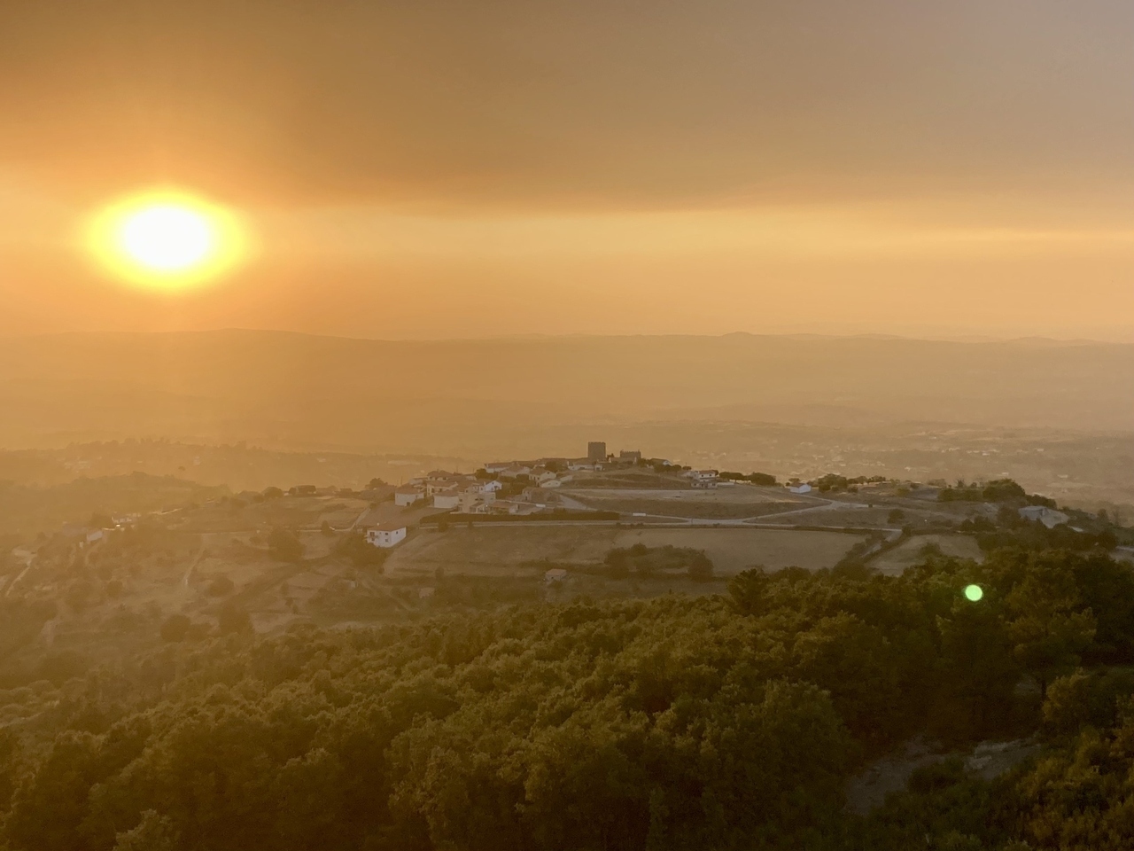 Het kasteel zie je al van ver, van op de steile grindhellingen aan de andere kant van de vallei. Op de top torent het 820 meter boven de zeespiegel uit. Vanaf het kasteel klim ik nog honderd meter hoger, over een mooie grindweg die een spectaculair uitzicht bied over de heuveltop waarop Linhares met zijn kasteel gebouwd werd. Mijn adem wordt benomen door het schitterende uitzicht over de vallei, maar ook door de rook. De zon, die als een rode vuurbol achter de rookwolk schuilt, hult alles in een vreemde oranje gloed.