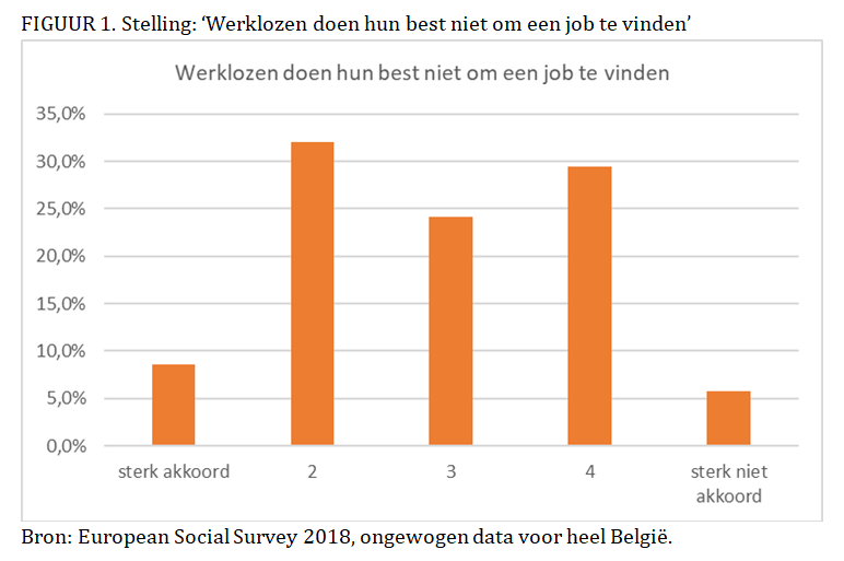 Toch hebben veel mensen het gevoel dat werklozen te weinig hun best doen om een job te vinden. De European Social Survey (FIGUUR 1) geeft bijvoorbeeld aan dat 40% van de Belgen vindt dat werklozen te weinig hun best doen om een job te vinden; een kwart is hier neutraal. Een minderheid, één op drie, heeft dus het idee dat werklozen wel hun best doen.