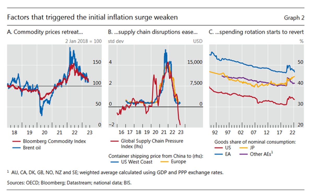 Twee recente papers zetten nu de analyse van ‘team tijdelijk’ opnieuw kracht bij. Ten eerste geeft het Annual Economic Report 2023 van de BIS duidelijk aan dat ondertussen alle grote grondoorzaken van de inflatie-opstoot zich inderdaad opnieuw aan het omkeren zijn (zie FIGUUR hieronder).
