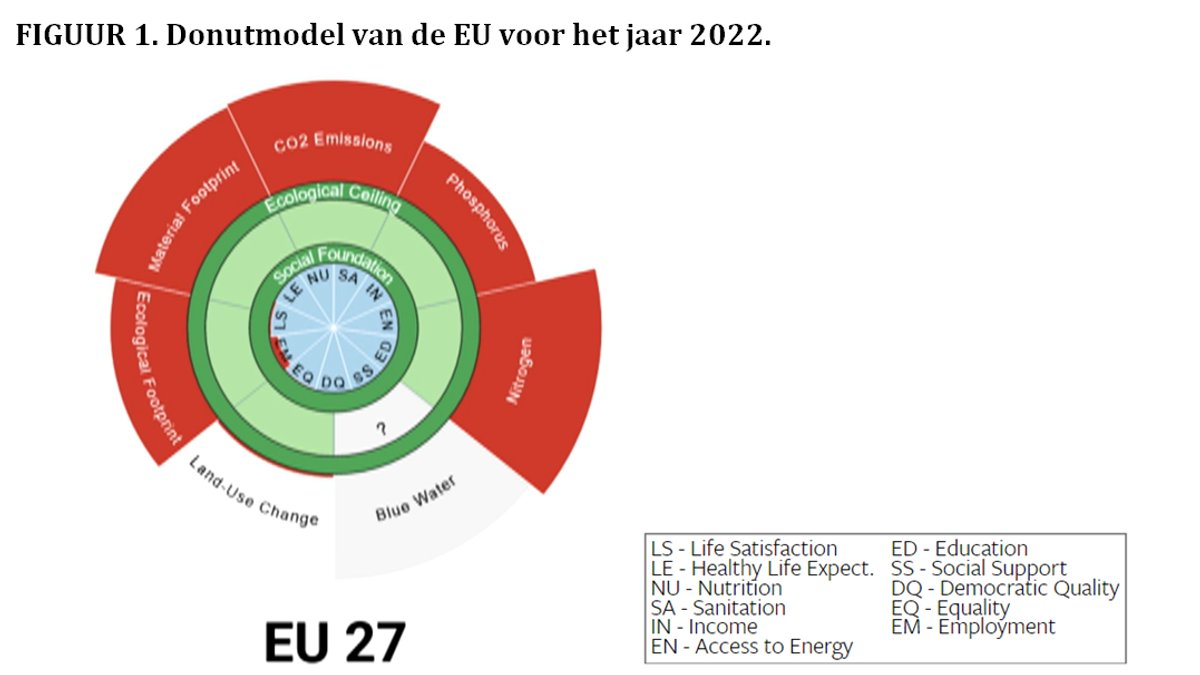 De rode vlakken laten zien of en hoeveel de EU één van de twee grenzen overschrijdt. Dankzij haar sterke welvaartsstaten scoort de EU globaal genomen goed op het sociale aspect en breekt ze zelden door het sociale fundament. Echter, wanneer we kijken naar de ecologische bovengrens zien we dat de Europese economieën sterk bijdragen aan de planetaire vernieling.