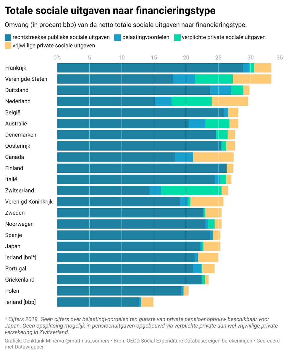 Onze buurlanden Frankrijk, Duitsland en Nederland geven allen meer uit aan het nastreven van sociale doelstellingen, net zoals de Verenigde Staten. Wél doen die verschillende landen dat elk op een heel eigen wijze, waarbij zeker de Verenigde Staten en Nederland (net zoals Zwitserland), elk op hun manier, zeer sterk de nadruk leggen op de rol van private spelers in de financiële organisatie van het sociaal beleid, terwijl die rol in België relatief beperkt blijft, precies omdat de overheid hier een grotere rol op zich neemt.
