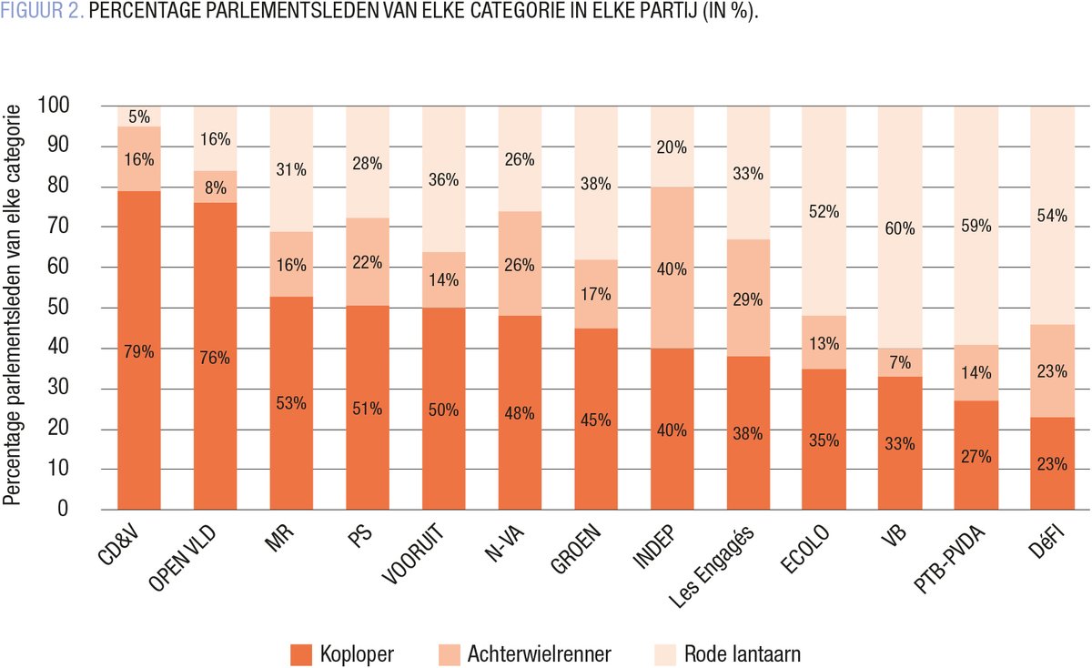 Als we de bestuursniveaus vergelijken, zien we dat er iets meer koplopers in het federale parlement zitten dan in de regionale parlementen. Dit zou erop wijzen dat volksvertegenwoordigers op nationaal niveau iets zichtbaarder zijn op sociale media dan hun collega’s in de regionale parlementen. Als het echter om de meerderheid gaat, verdwijnt dit verschil. Als we naar de oppositie op federaal niveau kijken, bevat deze verhoudingsgewijs minder rode lantaarns. Dit kan deels worden verklaard door een verrassende observatie: van alle meerderheidspartijen op federaal niveau is Ecolo de enige partij met meer rode lantaarns (9 op 13 volksvertegenwoordigers) dan koplopers (3 op 13). Ter vergelijking, CD&V heeft geen rode lantaarns en slechts 2 achtervolgers (en dus 10 koplopers op 12 volksvertegenwoordigers).1