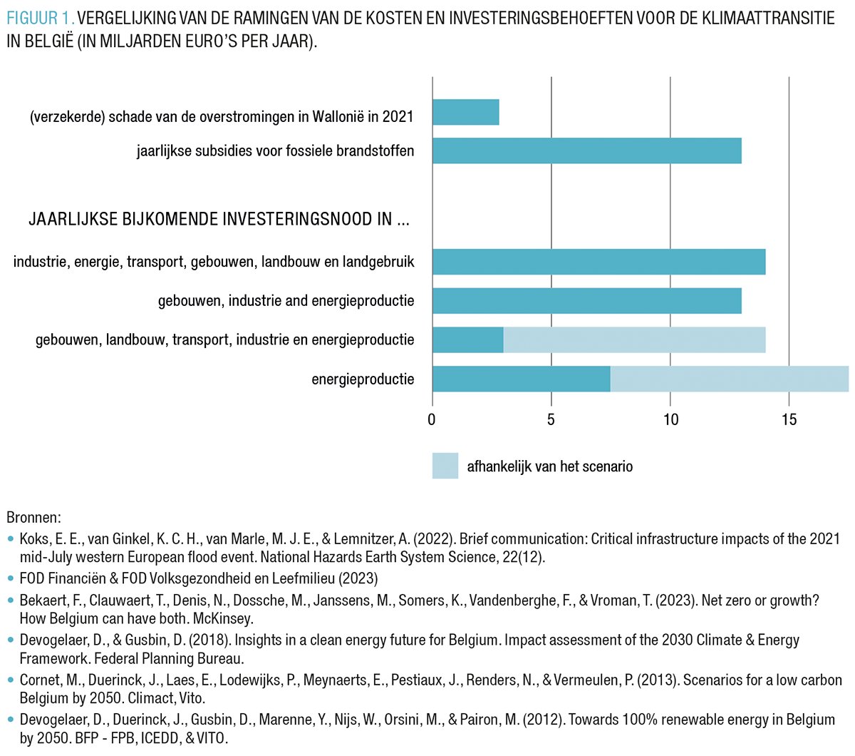Ten eerste zijn dit investeringen in kapitaalgoederen (productietechnologie, infrastructuur, gebouwen, wagens), die ook – op korte, middel- of (zeer) lange termijn – zullen opbrengen. Ten tweede zijn de geschatte investeringsnoden niet enkel voor de rekening van de overheid. Specifiek Belgische cijfers zijn niet beschikbaar, maar voor Europa maakten overheidsinvesteringen anno 2022 ongeveer 40% van de klimaatfinanciering uit, terwijl private actoren 60% voor hun rekening nemen. Een achterkant-van-een-bierkaartje berekening komt zo op ongeveer 1% van het bbp aan investeringsnoden te ledigen door de overheid. Dit is niet min, maar in het bredere begrotingskader – waar bijvoorbeeld 6,7% van het bbp wordt gespendeerd aan economische zaken, waaronder zo’n 17 miljard aan door Nationale Bank als onproductief bestempelde loonsubsidies – evenmin onoverkomelijk.