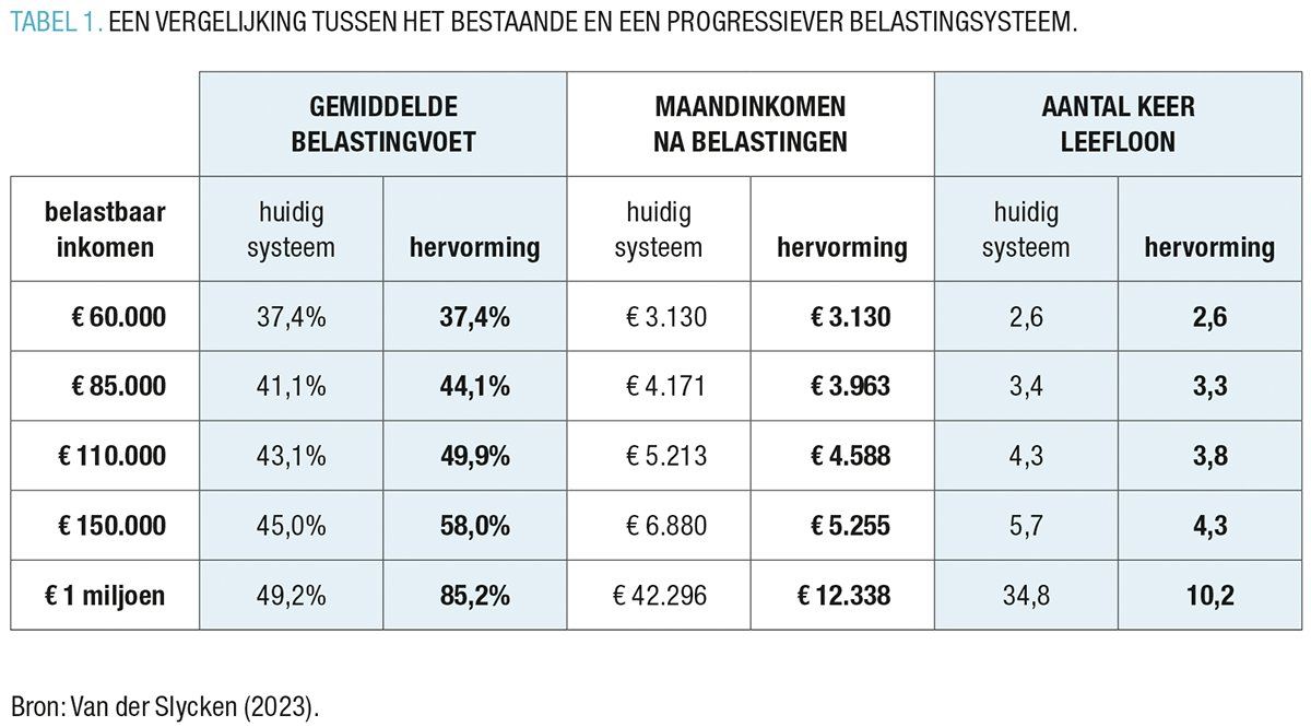 Deze grootverdieners gaan hierdoor geen boterham minder eten. Want minder dan 5% van de bevolking had in 2017 een belastbaar inkomen hoger dan €60.000. Met een inkomen van meer dan €150.000 zat je tot de top 1%, terwijl slechts 0,5% meer dan €150.000 had. De sterkte schouders kunnen best wat meer lasten dragen. Zoals TABEL 1 illustreert, verdient iedereen door deze progressieve hervorming netto minder dan 10,2 keer het leefloon – €1.214,13 per maand voor een alleenstaande begin 2023. Voldoende loon naar werken.