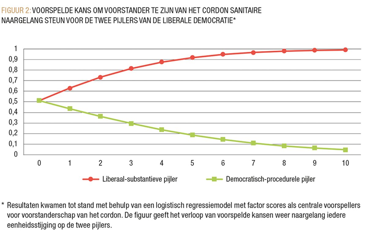 Respondenten die een democratisch-procedurele interpretatie aanhangen – en dus veeleer politieke legitimiteit toekennen aan de wil van het volk – zijn eerder geneigd het cordon te beschouwen als een door de politieke elite opgelegde en onrechtmatige inperking van de volkssoevereiniteit. Wie vooral belang hecht aan een liberaal-substantieve invulling van democratie – en dus vooral politieke legitimiteit toekent aan liberale waarden en instituties – is daarentegen eerder geneigd om te pleiten voor een cordon rond extreemrechts. Daarnaast zien we ook dat een onvoorwaardelijke visie op vrijheid van meningsuiting, de neiging tot complotdenken en een rechtse politieke oriëntatie tegenstand voeden tegen het cordon sanitaire.