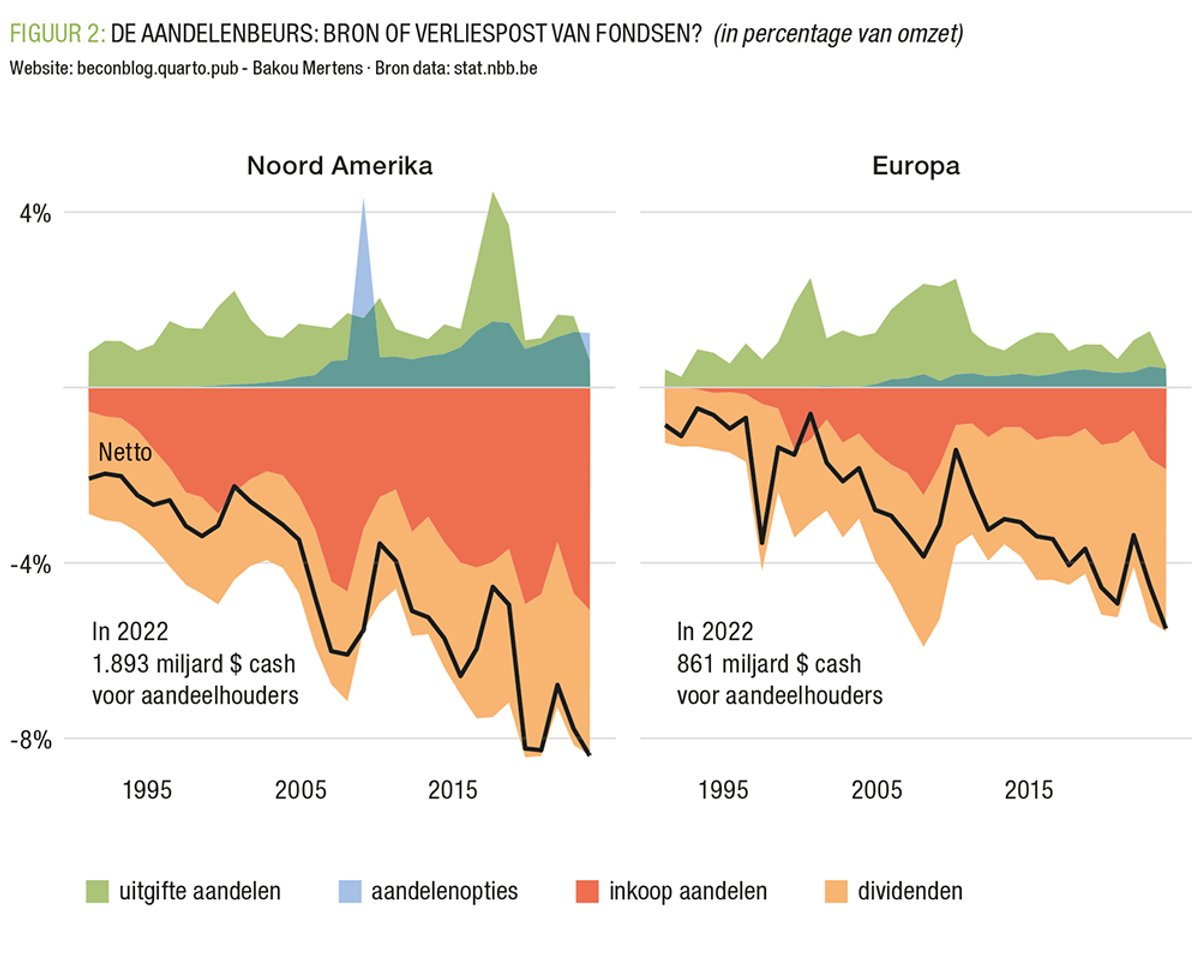 Er vloeit dus toch redelijk wat cash geld van bedrijven via dividenden en buybacks naar aandeelhouders. Aandeelhouders – die zich vaak al in de top van de inkomensverdeling situeren – bekomen zo een quasi constante en relatief weinig belaste aanvullende stroom inkomen louter door het bezit van financiële activa – in eerste instantie vaak bekomen via erfenis of schenking. Doordat aandeelhouders vaak al een hoog inkomen hebben, wordt dat bijkomstige financiële inkomen vaak niet geconsumeerd maar herbelegd waardoor het geen maatschappelijke bijdrage levert aangezien de aandeelhouder ook druk kan uitoefenen op bedrijven om geen nieuwe aandelen uit te geven. Dankzij de constante toestroom van verse beleggers – aangepraat door steeds dikker wordende beleggingskaternen in kranten of misleidende filmpjes op sociale media – kunnen bestaande aandeelhouders ook nog sterke meerwaarden op hun beleggingen realiseren, die in België (in tegenstelling tot de VS) bovendien onbelast blijven.