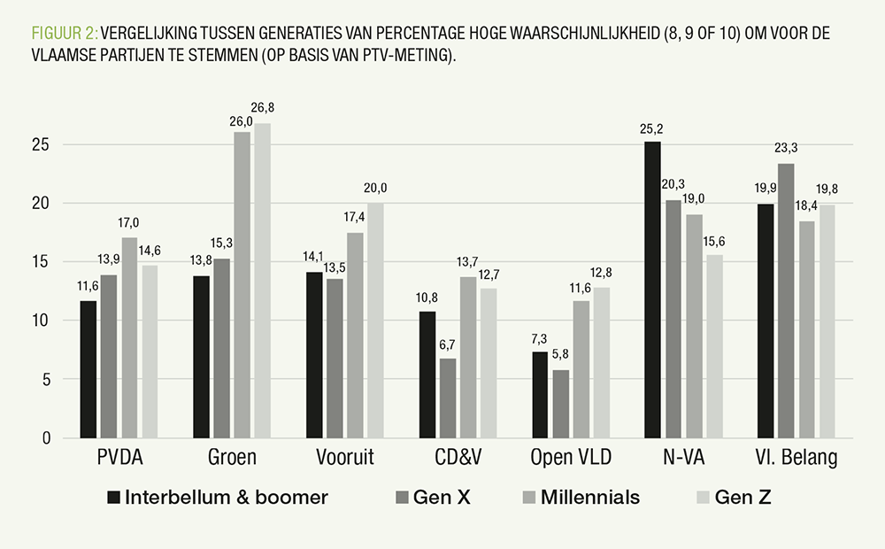 FIGUUR 2 geeft het percentage kiezers weer die waarschijnlijk zullen stemmen voor de partijen over de verschillende generaties heen. Het valt op dat vooral voor twee linkse partijen – in de eerste plaats Groen, gevolgd door Vooruit – een hoger percentage uit de jongste generaties (Gen Z en Millennials) aangeeft met grote waarschijnlijkheid voor de partij te stemmen. Voor N-VA tekenen we vooral hogere percentages op die waarschijnlijk voor de partij zullen stemmen onder de oudere generaties; de hoge percentages onder de ‘Interbellum en boomer’ generaties vallen hierbij op. Voor andere partijen zijn de trends minder eenduidig.