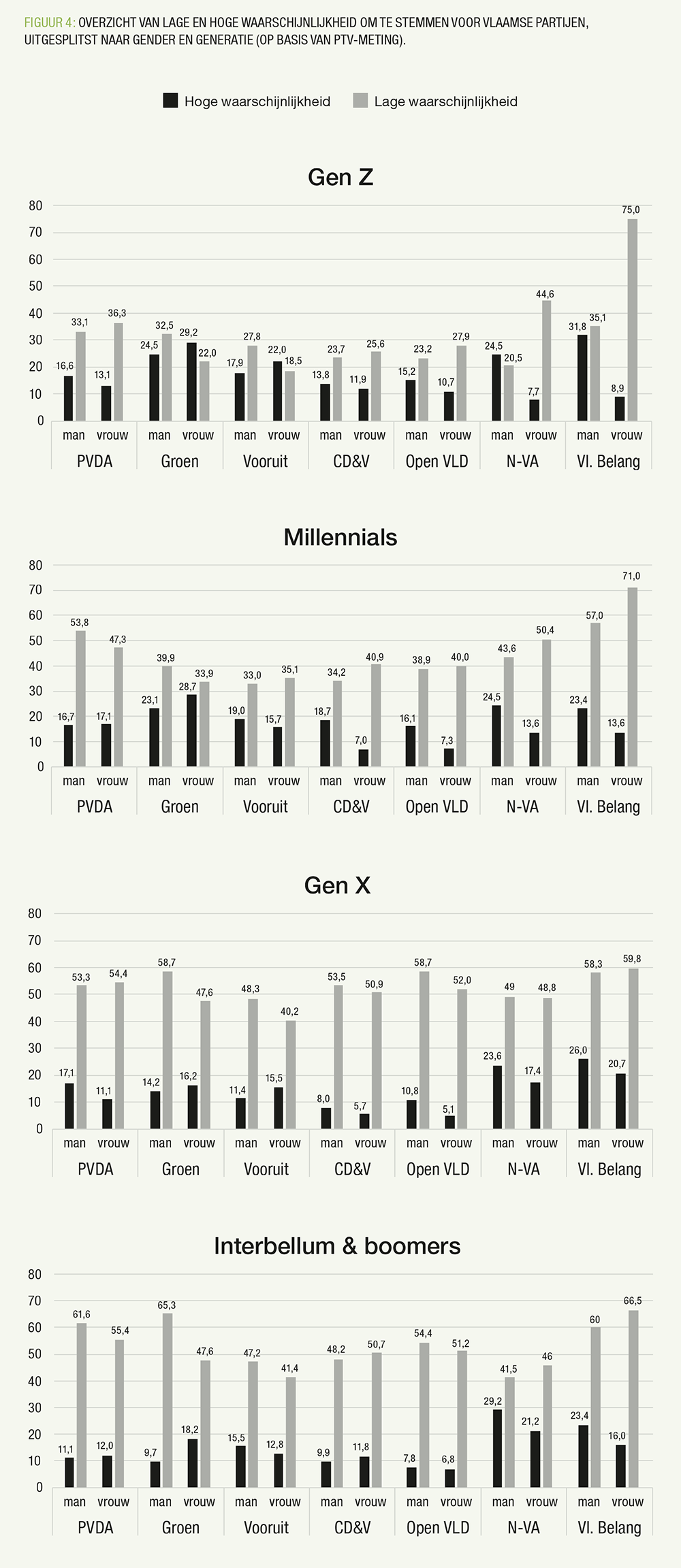 FIGUUR 4 geeft nog eens alle percentages weer voor zowel lage als hoge waarschijnlijkheid om voor alle Vlaamse partijen te stemmen, uitgesplitst naar zowel gender als generatie. Daarin zien we dat verschillen tussen mannen en vrouwen erg uitgesproken zijn voor Generation Z in vergelijking met de andere generaties.