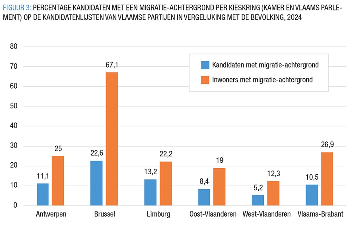 In Brussel heeft 22,6% van de kandidaten op de kandidatenlijsten voor het Vlaams Parlement een migratie-achtergrond, terwijl dat in West-Vlaanderen slechts 5,2% is.