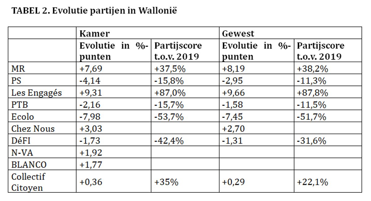 Er ging een schokgolf door Wallonië na de verkiezingsuitslag van 9 juni. Er waren twee duidelijke winnaars. MR haalde 28,2% van de stemmen in de Kamer, 29,6% in het Gewest en 36,3% in Europa (TABEL 1). De Franstalige liberalen staan op één van hun hoogste niveaus ooit ; in 2003 haalden ze al eens 28,5% en in 2007 31,1%. Voor de tweede keer in de geschiedenis in de Kamer en voor het eerst in de Waalse gewestverkiezingen is de liberale familie groter dan de socialistische. De andere grote winnaar was Les Engagés. Het voormalige cdH kwam spectaculair terug van de verkiezingen van 2019 en doorbrak de electorale neergang. Samen halen MR en Les Engagés een meerderheid om Wallonië en de Franse Gemeenschap (Federatie Wallonië-Brussel) te besturen.