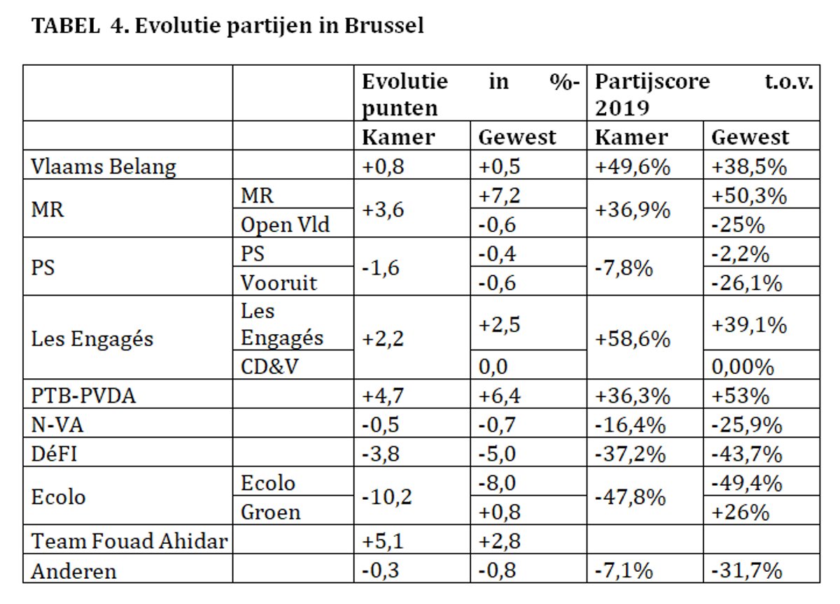 - De vertrekkers onder de Ecolo-kiezers gingen niet naar dezelfde partijen als in Wallonië. De partij die het meest profiteert is PS (12,5%). Dit zorgde niet voor winst voor PS, omdat ze zelf slachtoffer werd van aanzienlijk vertrek van kiezers naar PTB-PVDA. PS verloor terrein in het noorden en westen van Brussel en won in de gemeenten in het zuid-oosten. MR profiteerde van de komst van 12% Ecolo-kiezers, Les Engagés haalde 8% van hen binnen.