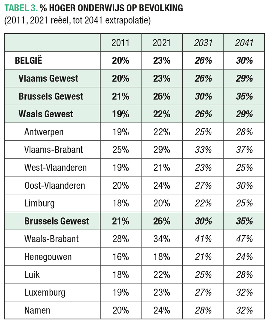 Voor het % in de bevolking met een hogere opleiding en de evolutie tot 2042 (TABEL3), voortgaande op deze van 2011 tot 2021, zie de lijst van gemeenten en gewesten in de linken in voetnoot 4.4