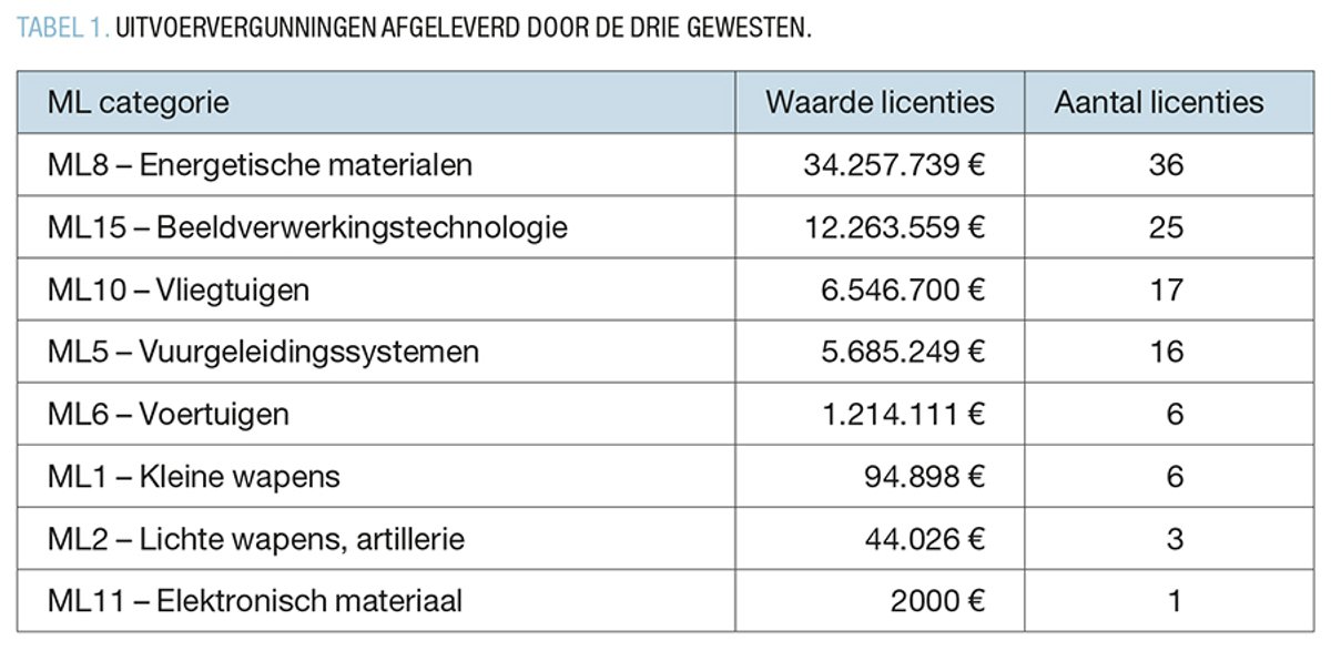 Ook betekent de beslissing uit 2009 niet dat alle export van militaire goederen naar Israël stopte. Sindsdien is er voor ongeveer 60 miljoen euro aan uitvoervergunningen afgeleverd door de drie gewesten (TABEL 1).