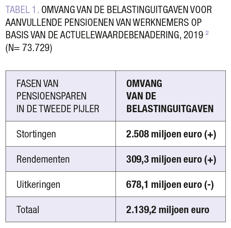 Deze nieuwe berekeningen tonen dat de budgettaire impact van de belastinguitgaven voor aanvullende pensioenen van werknemers iets meer dan 2,1 miljard euro of 0,45% van het bruto binnenlands product (bbp) bedraagt voor het jaar 2019. Dit bedrag wordt berekend door de belastinguitgaven voor de voordelige socialezekerheidsbijdragen en belastingen op de stortingen te vermeerderen met de belastinguitgaven voor de belastingvrijstelling van de rendementen. Deze som wordt vervolgens verminderd met de belastingopbrengsten die worden geïnd op de aanvullende pensioenuitkering. De berekening wordt samengevat in TABEL 1.