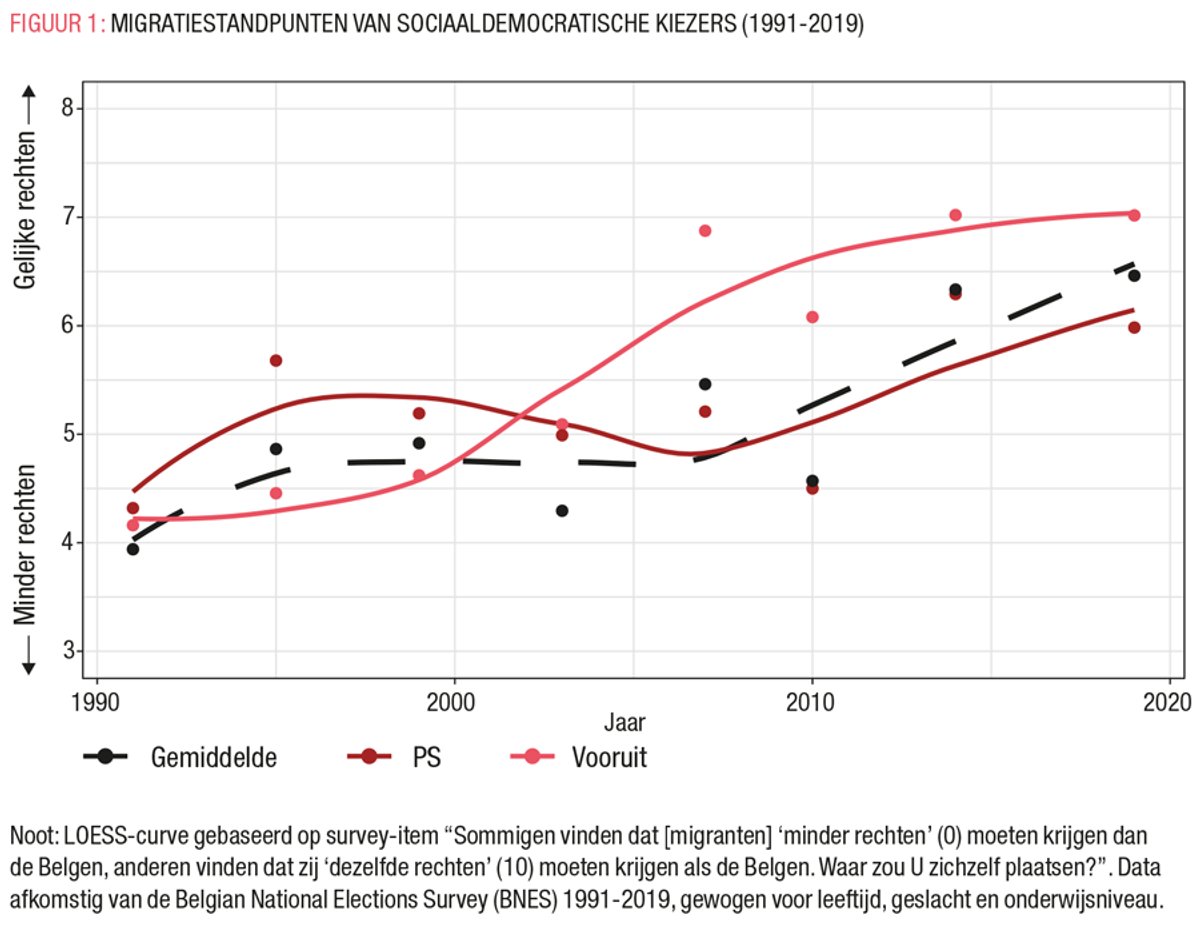 Om het electorale succes van beide migratiestandpunten te evalueren, vormt België een interessant politicologisch laboratorium. Zowel PS als Vooruit varen als principiële voorstanders van migratie een cultureel universalistische koers, maar PS is er veel beter in geslaagd om de electorale steun van de arbeidersklasse te behouden. Het leidt tot de bijzondere constellatie dat – hoewel PS zich inzake culturele thema’s doorgaans even progressief opstelt – haar kiezers ideologisch net een stuk conservatiever zijn dan die van Vooruit.