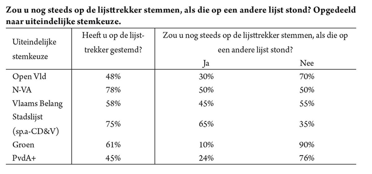 Het belang van lijsttrekkers in verkiezingscampagnes staat buiten kijf, hun precieze belang kan wel sterk schommelen tussen partijen. Bij alle partijen heeft bijna de helft (PvdA en Open Vld) tot drie vierde van de kiezers (Stadslijst, N-VA) een voorkeurstem voor de lijsttrekker uitgebracht. Verder blijkt dat de lijsttrekker vooral bij de Stadslijst doorslaggevend was in de stemkeuze. Want ruim twee derde van de Stadslijst-kiezers zou Patrick Janssens volgen naar een andere partij. Allicht gedeeltelijk het gevolg van de wat partijloze stijl van burgemeester Janssens. Al sluiten we niet uit dat een deel van de kiezers van de Stadslijst in ons panel de afzonderlijke partijen sp.a en CD&V als een andere partij hebben beschouwd. Verder valt op dat de helft van de N-VA-kiezers lijsttrekker De Wever zou volgen naar een andere partij. Daarmee is hij duidelijk van groter belang voor zijn partij dan de lijsttrekkers van Groen, Open Vld en PvdA+.